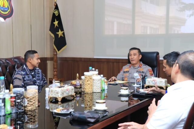 POLDA Jambi bersama Pangkalan TNI Angkatan Laut (Lanal) Palembang, Sumatra Selatan, siap bahu-membahu untuk pengamanan wilayah perairan pantai timur Jambi. Semangat sinergitas tersebut mengemuka pada pertemuan antara Kapolda Jambi Inspektur Jenderal Rusdi Hartono dengan Danlanal Palembang Kolonel Laut (P) Faisal di Mapolda Jambi, Kamis (9/1). Turut hadir pada pertemuan silaturahmi tersebut, Dirreskrimsus Polda Jambi Kombes Bambang Yugo Pamungkas, Dirpolairud Polda Jambi Kombes Agus Tri Waluyo, Dandenpom Palembang Mayor Laut (PM) Billy Ranggamalela, Pasintel Lanal Palembang Mayor Laut (P) Yuliawan, dan Pasi Ops Lanal Palembang Lettu Laut Desi Sundari.