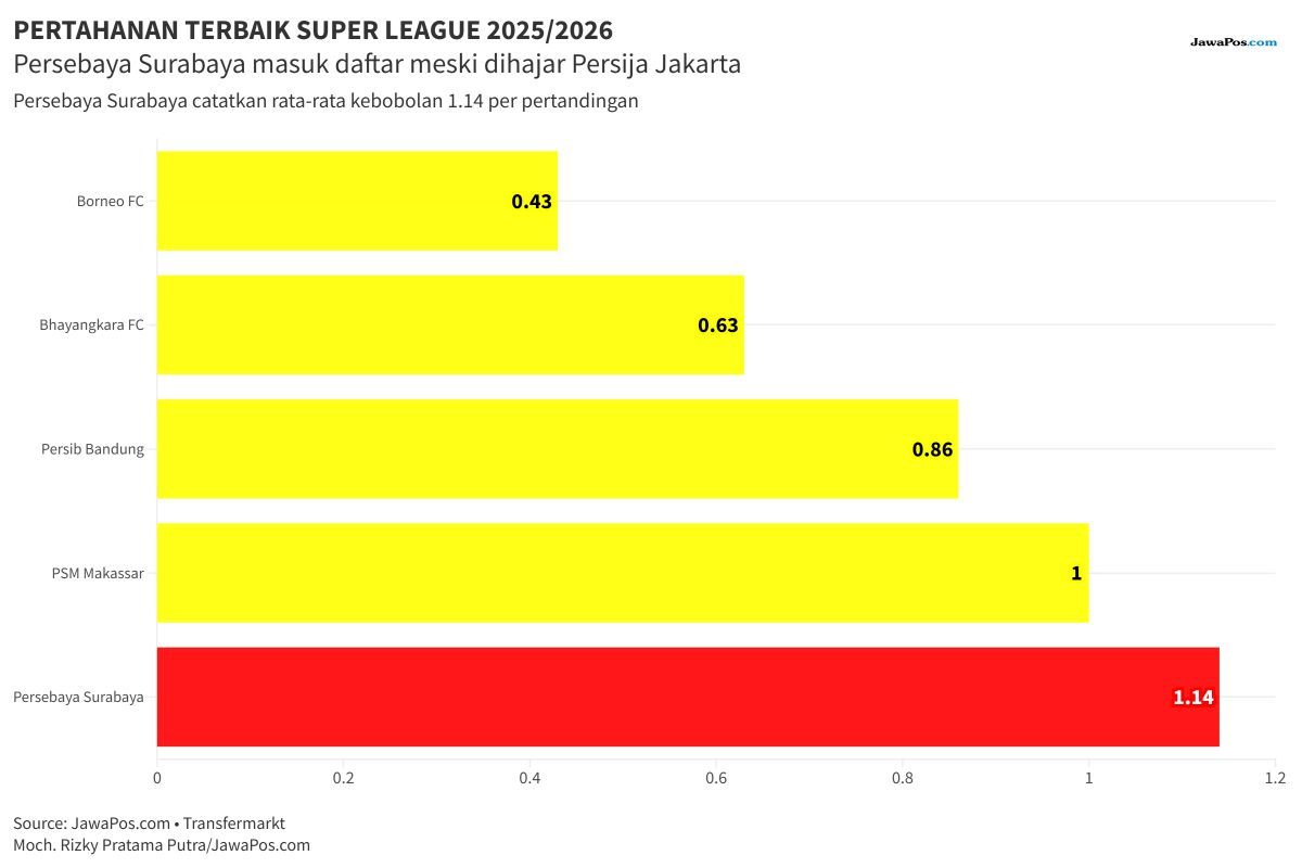 Hingga pekan ke-9, Persebaya Surabaya tercatat hanya kebobolan delapan gol dari tujuh pertandingan. Rata-rata kebobolan mereka sebesar 1,14 gol per laga masih menempatkan Green Force di posisi kelima dalam daftar pertahanan terbaik Super League 2025/2026.