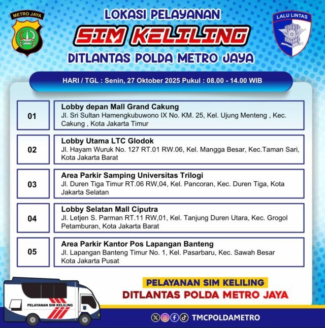 Berikut adalah jadwal layanan SIM Keliling Jakarta pada hari Senin (27/10/2025) :