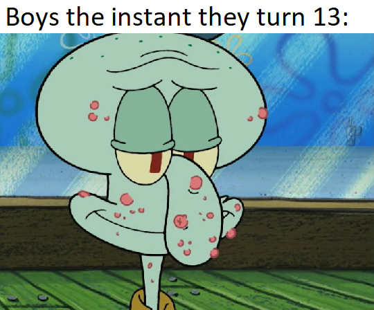 Kumpulan meme SpongeBob ini berhasil menggambarkan dengan akurat pengalaman masa puber yang dialami oleh banyak orang. Perubahan fisik seperti pertumbuhan tinggi badan, munculnya jerawat, dan rambut yang tiba-tiba muncul di bagian tubuh tertentu dijadikan bahan lucu untuk dibuat meme. Berikut beberapa contohnya: