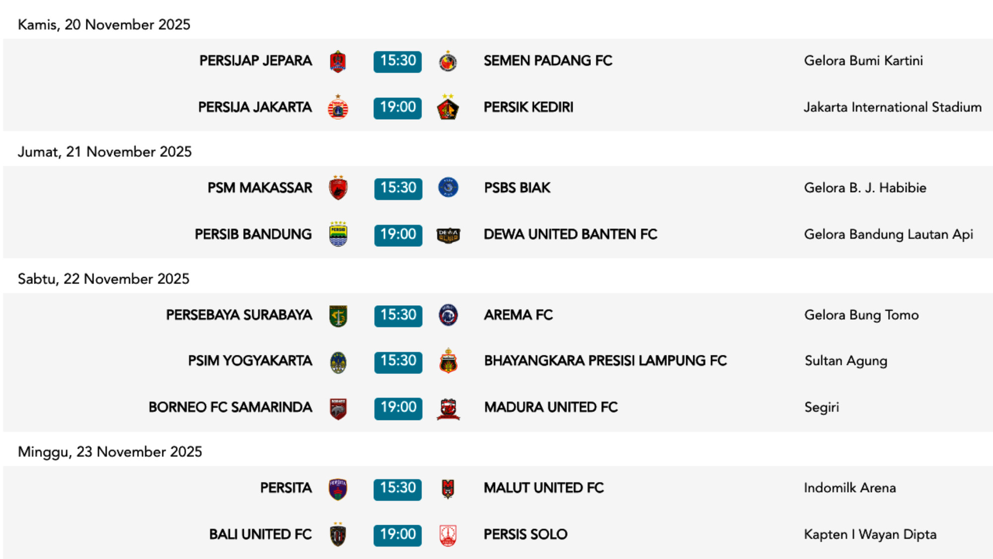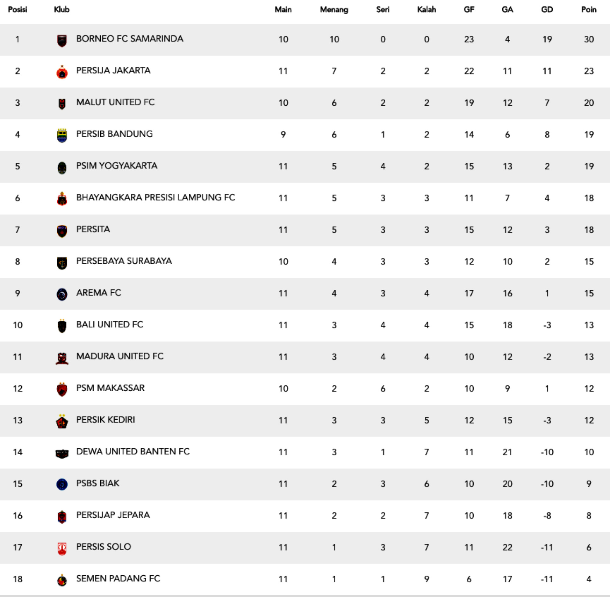 Klasemen Super League dan Jadwal Pekan ke-13