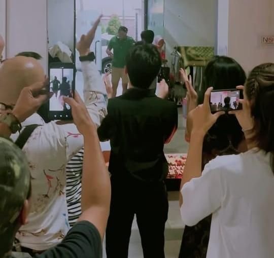 Masuk dengan baju kaos hijau dan celana pendek, Anjasmara kaget saat teman-teman sudah menyediakan beberapa kue ultah untuknya