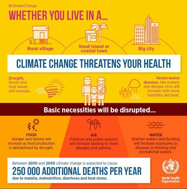 Berikut ini dampak yang terjadi pada kesehatan manusia akibat pemanasan global dan perubahan iklim: