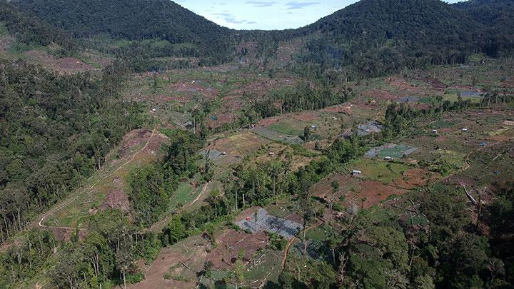 Foto udara kawasan ladang ilegal di dalam kawasan Taman Nasional Kerinci Seblat (TNKS), kaki Gunung Kerinci, Jambi, Senin 29 November 2021. Penebangan kayu dan pembukaan lahan ilegal dalam kawasan lindung taman nasional setempat masih terus terjadi dan bertambah parah dalam beberapa tahun terakhir. ANTARA FOTO/Wahdi Septiawan