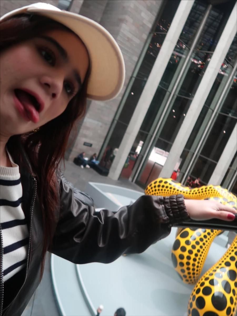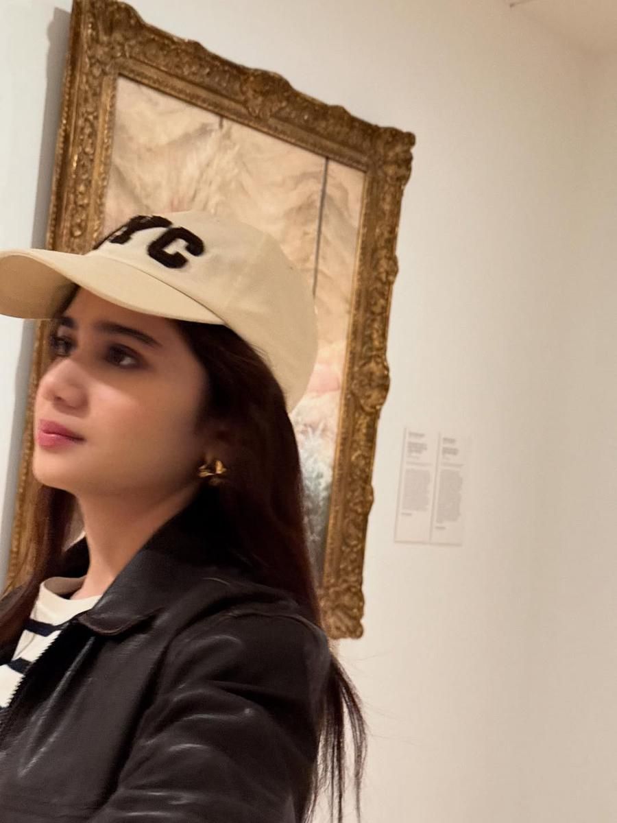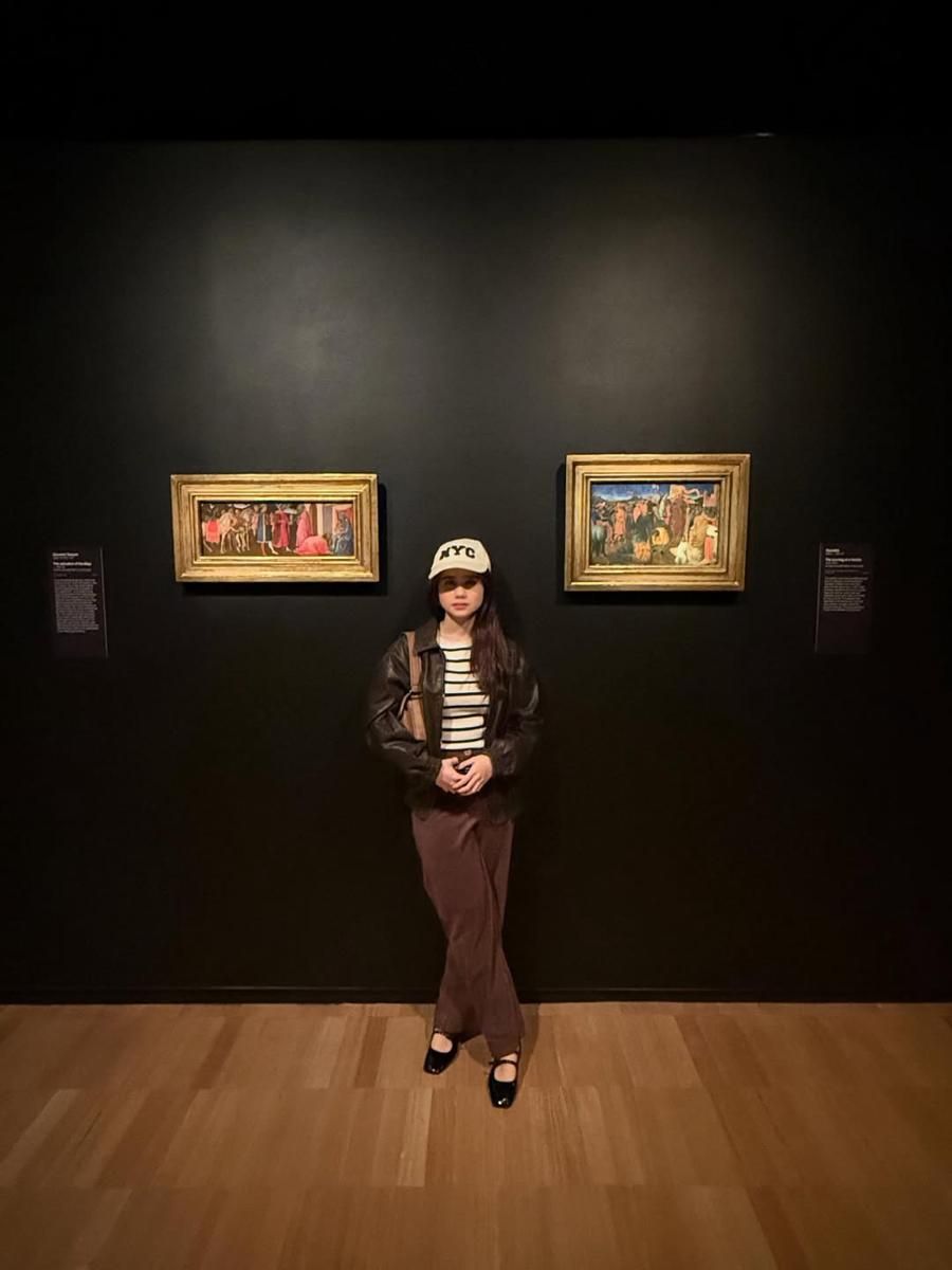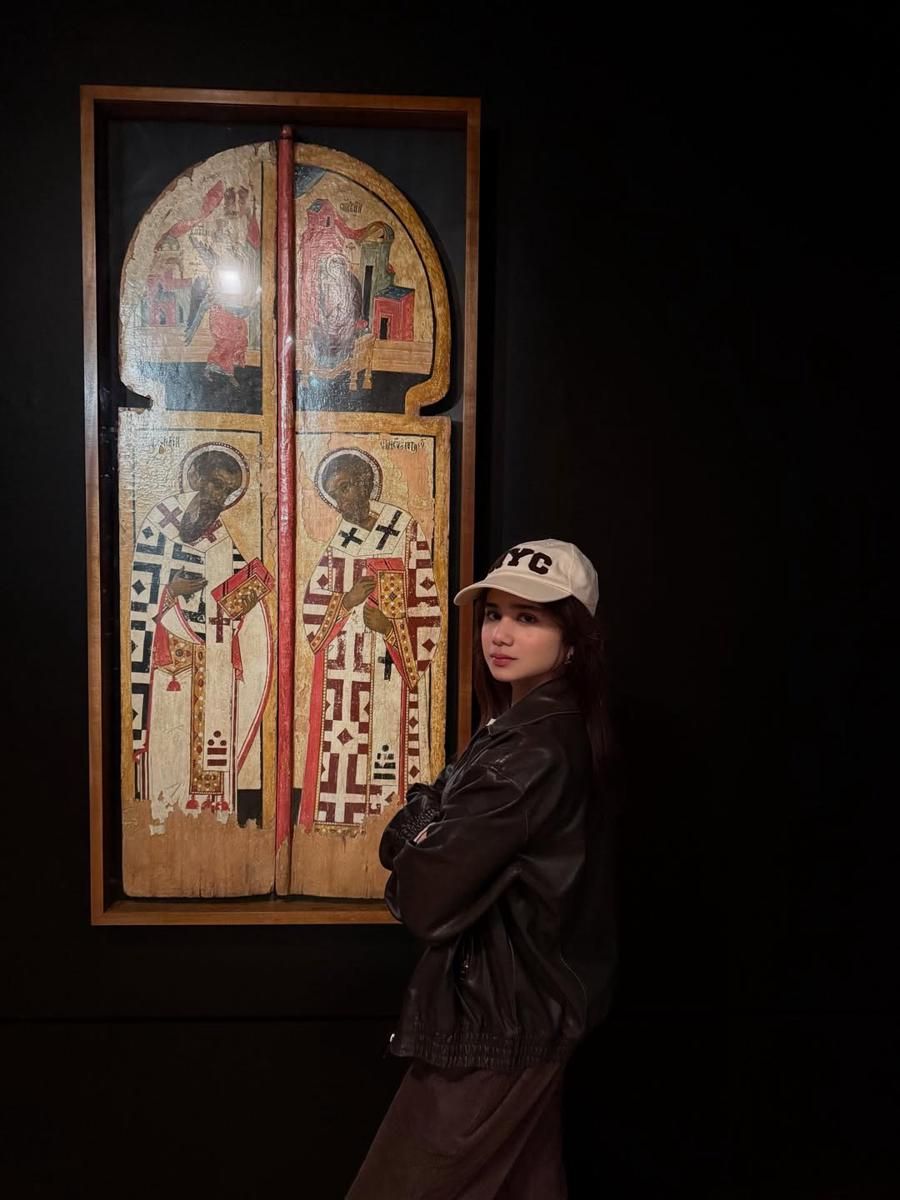 Dengan penampilan kasual dan aksesoris berupa topi, Tissa berkeliling melihat berbagai koleksi lukisan di galeri tersebut. Ia tampak nyaman dan menikmati setiap sudut dari tempat ini.