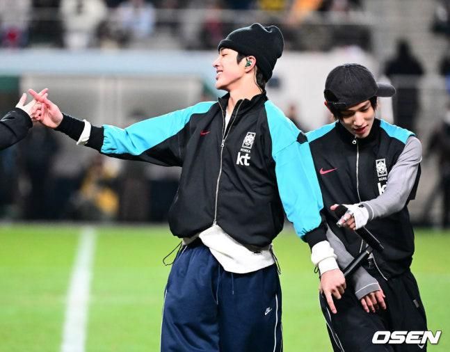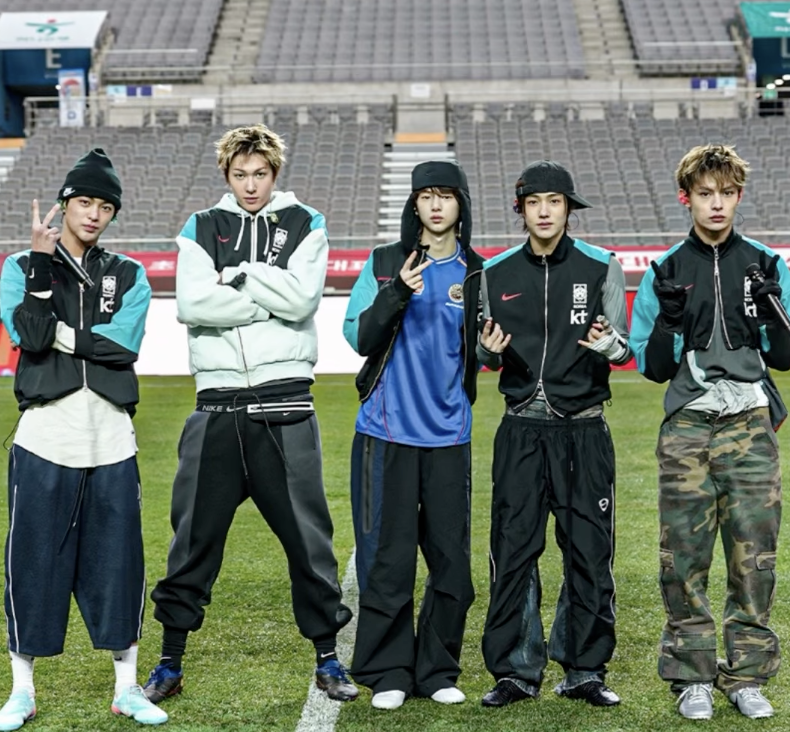 Penggemar juga memperhatikan bahwa para member tetap menggunakan sepatu bola meskipun tampil di atas pelindung rumput lapangan. Ini menunjukkan ketertarikan mereka pada olahraga sepak bola.