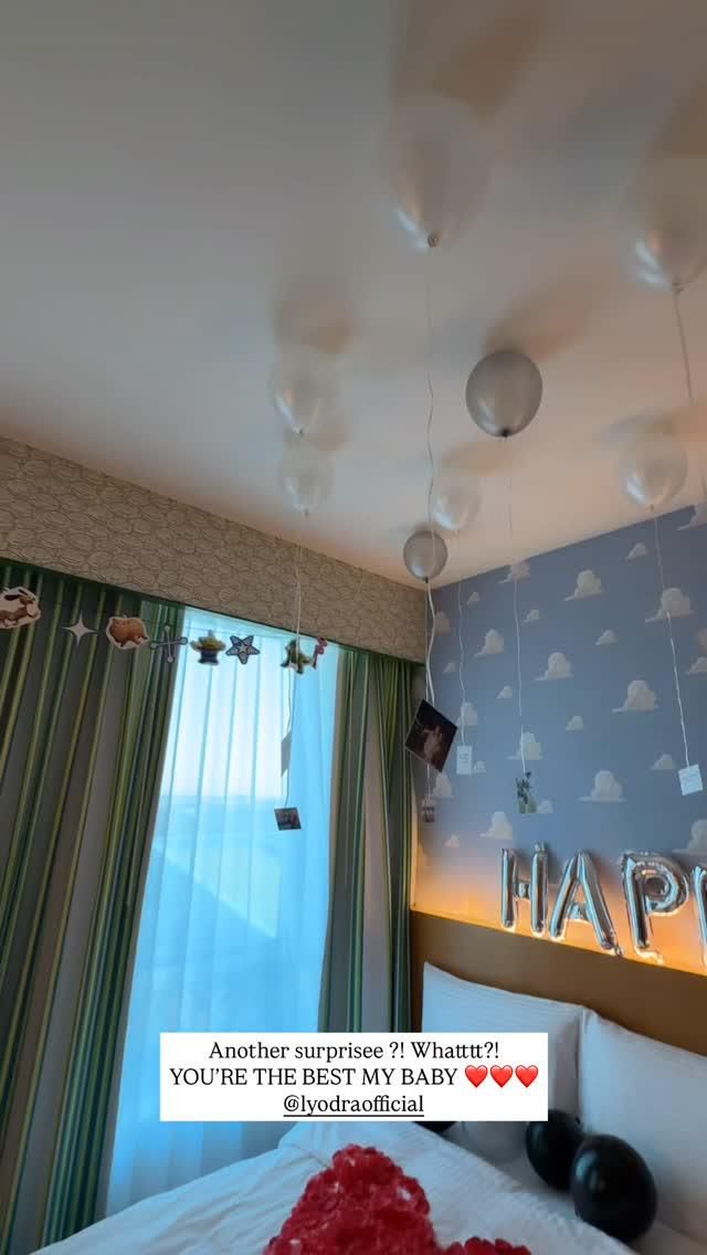 Lyodra terlihat sangat antusias dalam merayakan hari spesial Randy. Ia memberikan dukungan penuh dan kehangatan yang luar biasa.Dekorasi manis dibuat khusus untuk Randy di kamar tempatnya menginap