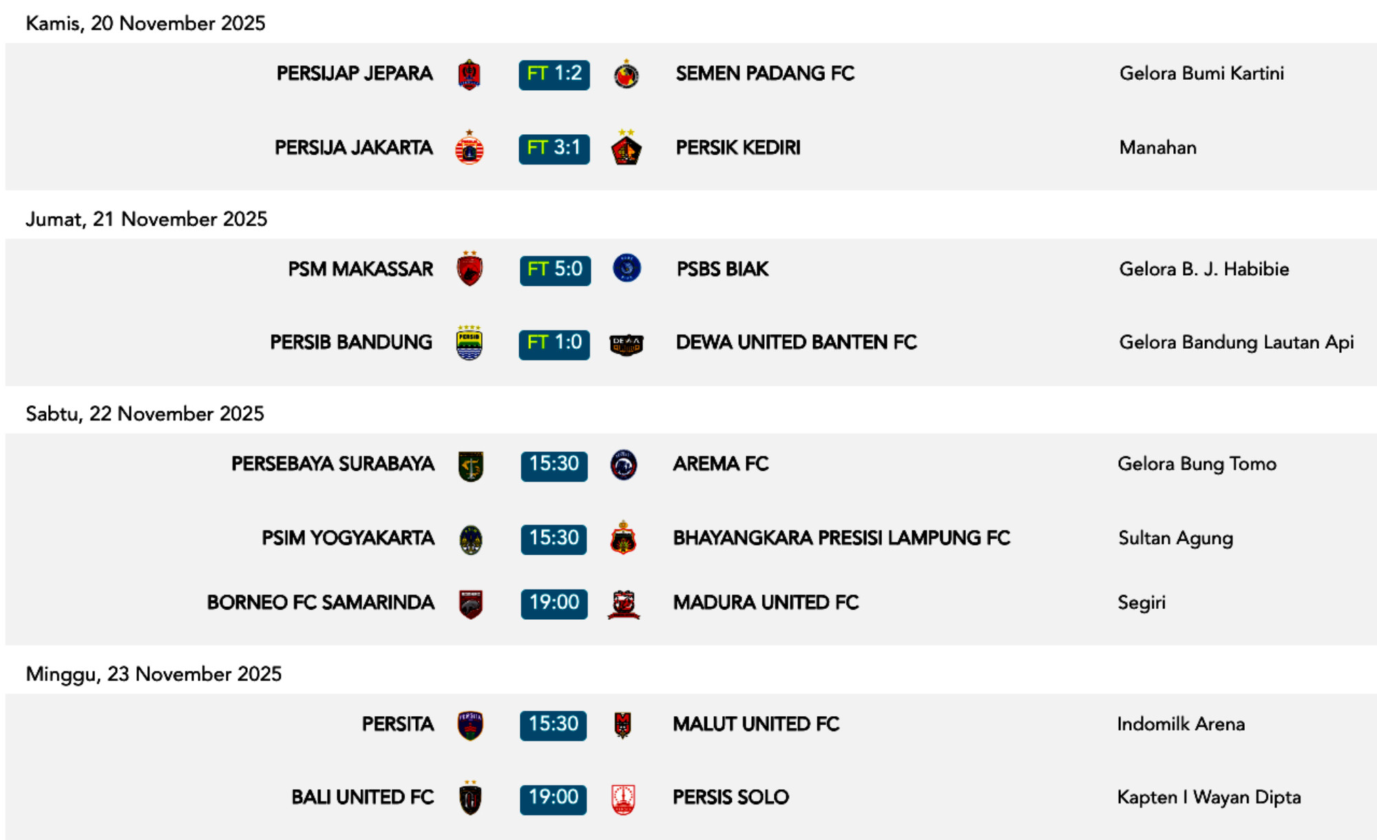 - Persebaya Surabaya vs Arema FC – Stadion Gelora Bung Tomo, Sabtu (22/11) pukul 15.30 WIB