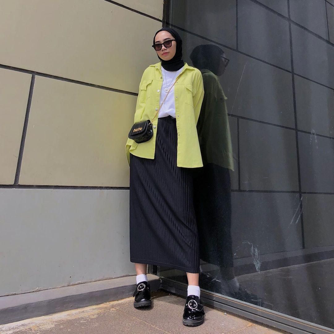 Jika ingin tampil syar’i, kamu bisa memadukan rok span warna cream dengan oversized outer dan hijab yang menutup dada. Tambahkan shoulder bag dan sepatu pantofel untuk menambah kesan anggun dan sopan.OOTD Rok Span Nuansa Kuning dan Putih
