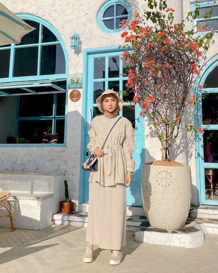 Jika bosan dengan model yang terlalu polos, rok span denim bisa menjadi pilihan. Pilih atasan warna cerah seperti peach agar tetap terlihat fresh. Tambahkan hijab pashmina dan shoulder bag untuk menambah kesan feminin. Cocok untuk ke bandara atau aktivitas santai lainnya.OOTD Rok Span Nuansa Putih Biru