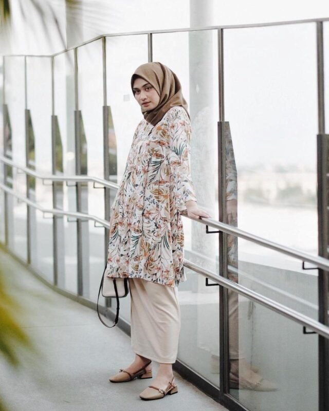 Untuk acara pesta, kamu bisa menggunakan rok span warna cream yang dipadukan dengan tunik motif bernuansa cokelat. Lengkapi penampilanmu dengan flat shoes dan sling bag agar tampak anggun dan elegan. Perpaduan ini cocok untuk acara semi formal seperti pesta.OOTD Rok Span Hijab Syar’i