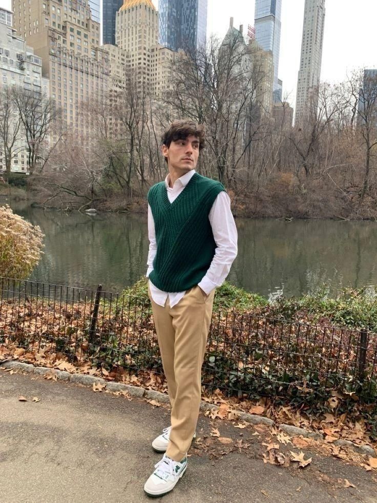 Lalu buat kamu yang ingin tampil lebih kalem, cobain deh kombinasi fashion ini. Dijamin image soft boy akan melekat kuat pada dirimu. Kamu bisa memadukan knit vest hijau dengan bawahan warna coffee brown. Sangat cocok untuk tampilan yang lebih low profile dan tidak terlalu mencolok perhatian.