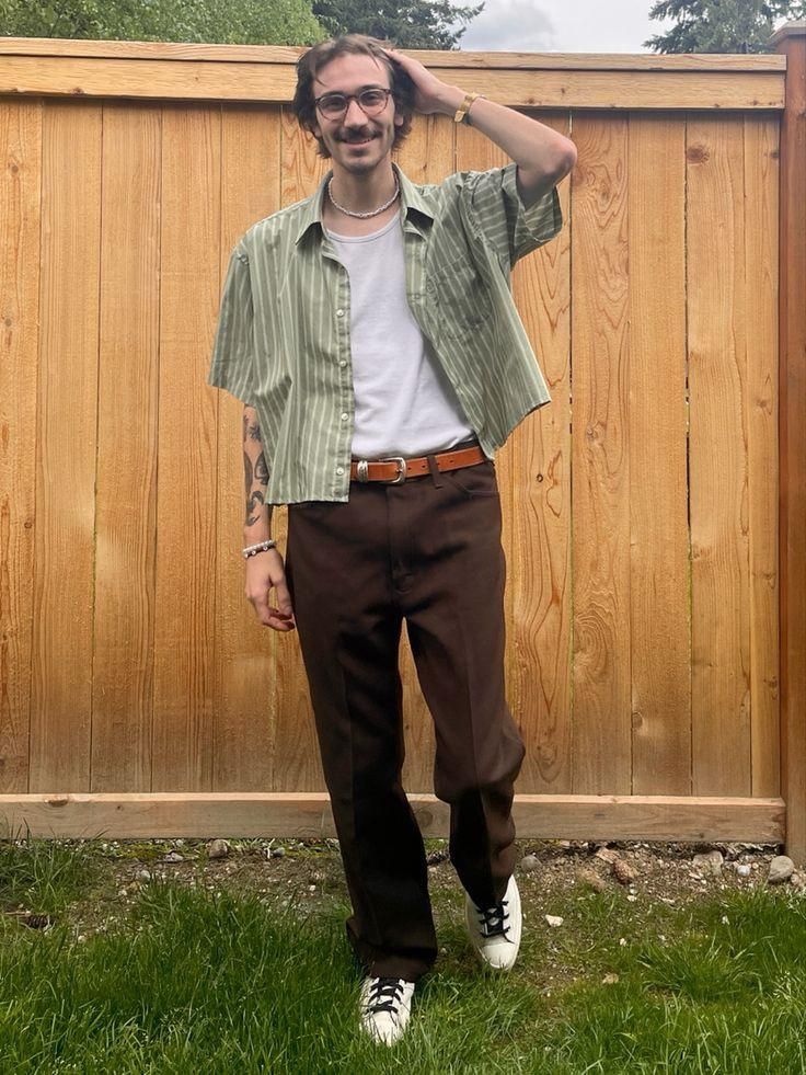Sedangkan buat kamu yang suka tampilan retro, bisa menjatuhkan pilihan pada fashion ini. Striped shirt sage green dan ranch pants warna dark brown memberikan kesan kasual dan klasik. Penggemar retro style pasti suka outfit ini, cocok dikenakan pada kegiatan sehari-hari ataupun untuk tampil santai di kegiatan hangout. Guna menyempurnakannya, kamu bisa memilih sepatu yang cocok dengan tampilan ini. Seperti sepatu berwarna putih maupun abu-abu.