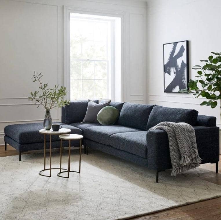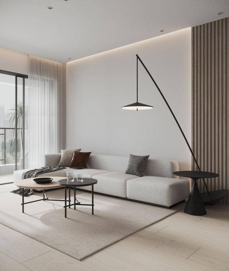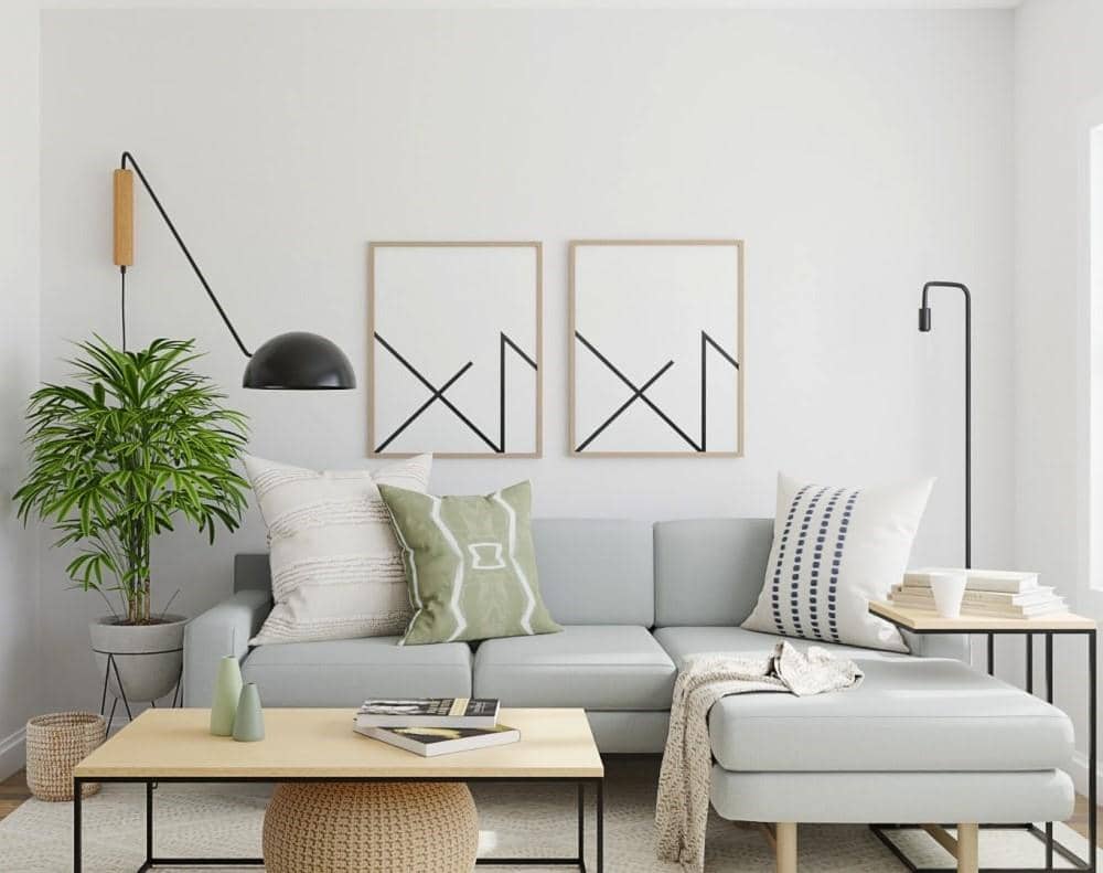 Jika kamu memiliki ruangan bernuansa putih, sofa berwarna abu-abu akan membuat desain ruang tamu minimalis yang elegan. Jangan lupa tambahkan meja dan furnitur lain seperti cermin