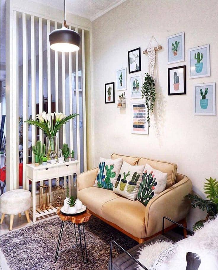 Selain tanaman, bingkai juga bisa mempercantik ruang tamu mungilmu. Jangan lupa tambahkan karpet berwarna senada sebagai pembatas antara ruang tamu dan ruang makan seperti pada gambar berikut ini