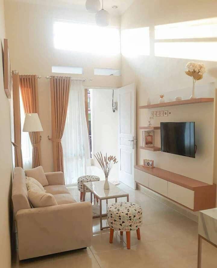Jika bosan dengan aksen hitam-putih untuk ruangan minimalis, kamu bisa mencoba warna-warna earth tone pada ruang tamu