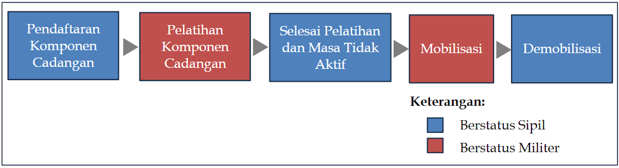 Ketika berstatus militer, anggota komponen cadangan terikat dengan hukum militer. Mahkamah Konstitusi (MK) telah memberikan landasan hukum atas status ini melalui putusannya pada 2021. Status ini jelas akan menjungkir-balikkan konsep ASN sebagai pegawai sipil.