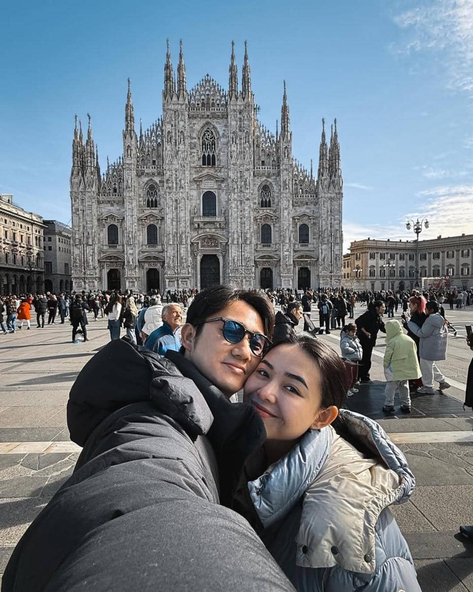 Mereka berdiri di area Piazza del Duomo, alun-alun utama kota Milan yang selalu ramai oleh turis. Keduanya terlihat menikmati waktu berdua sebelum punya anak.