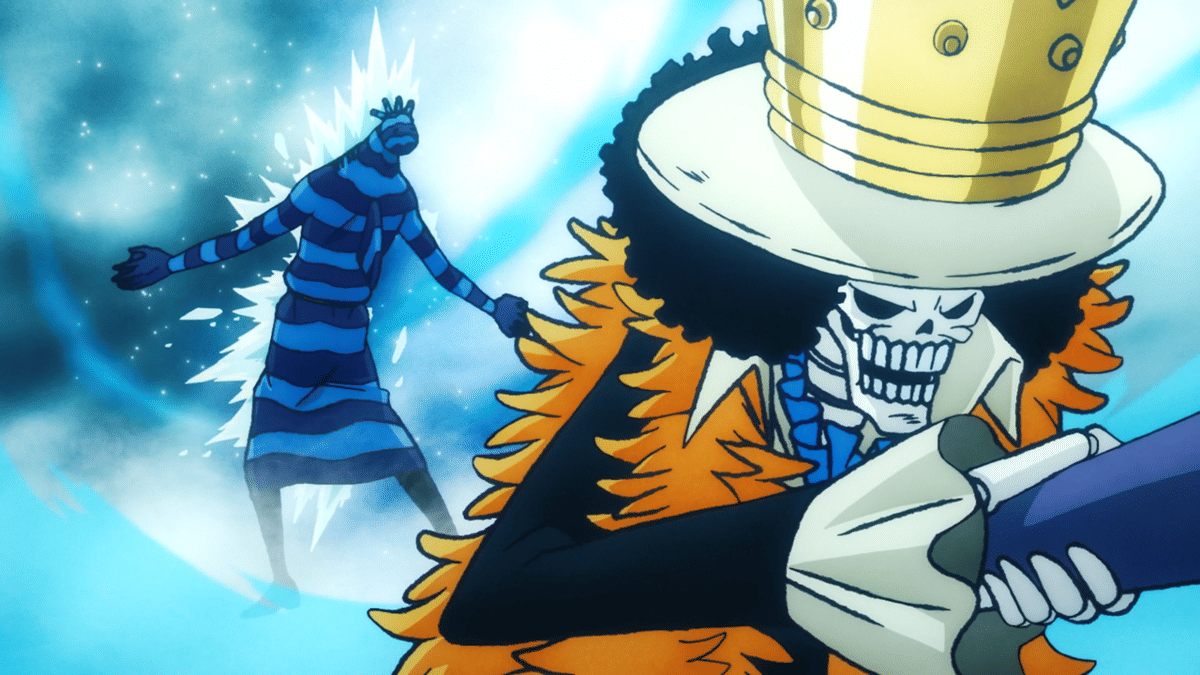 Brook, musisi dari Bajak Laut Topi Jerami, juga memiliki gaya berpedang yang unik. Gaya ini menggabungkan anggar dan iaido, menciptakan gerakan yang elegan dan luwes. Meski terlihat santai, Brook sangat mematikan karena kecepatannya. Kekuatan Yomi Yomi no Mi yang dimilikinya membuat lawan membeku jika terkena serangannya. Biasanya, Brook akan mengucapkan kalimat pamungkas sebelum menyerang, membuat lawan tak sadar bahwa mereka telah ditebas.