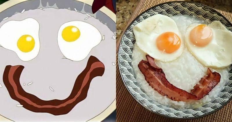 8. Sajikan Congee di atas mangkuk dan hias dengan telur dan beef bacon hingga menyerupai ekspresi wajah.