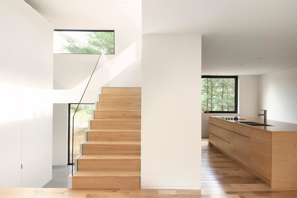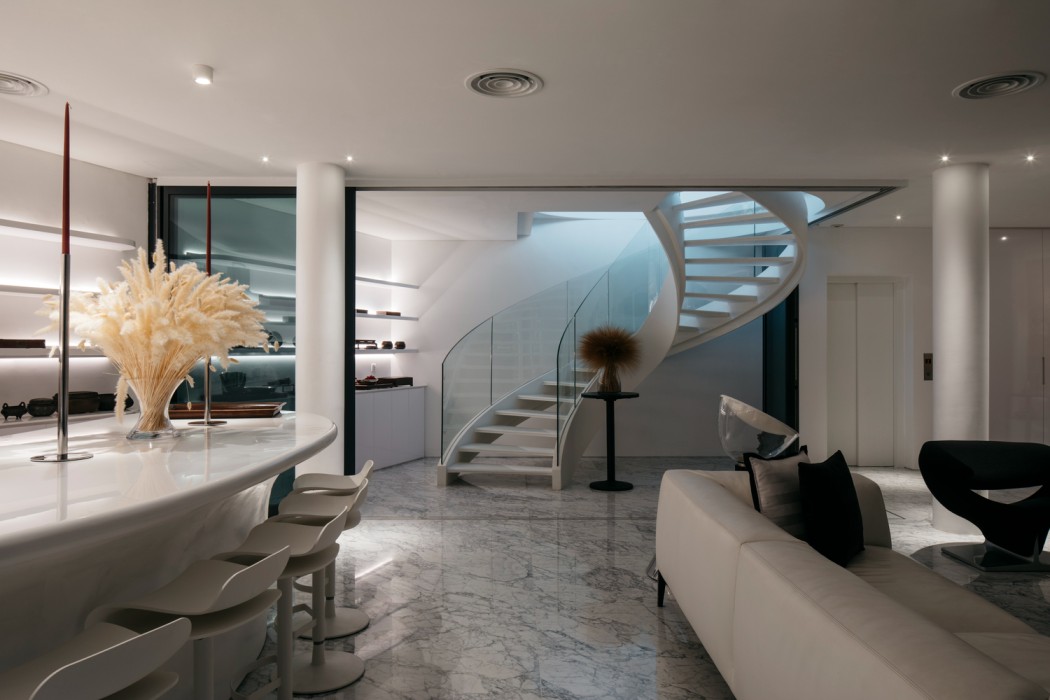 Desain ini menggunakan kaca sebagai bahan utama untuk membuat tampilan yang minimalis dan modern. Railing tangga kaca tanpa rangka menciptakan kesan seamless dan membuat area tangga terlihat lebih terbuka. Dipadukan dengan anak tangga berwarna cokelat natural dan struktur putih, desain ini memberikan kontras visual yang menarik. Selain estetika, kaca juga tetap fungsional sebagai pengaman.
