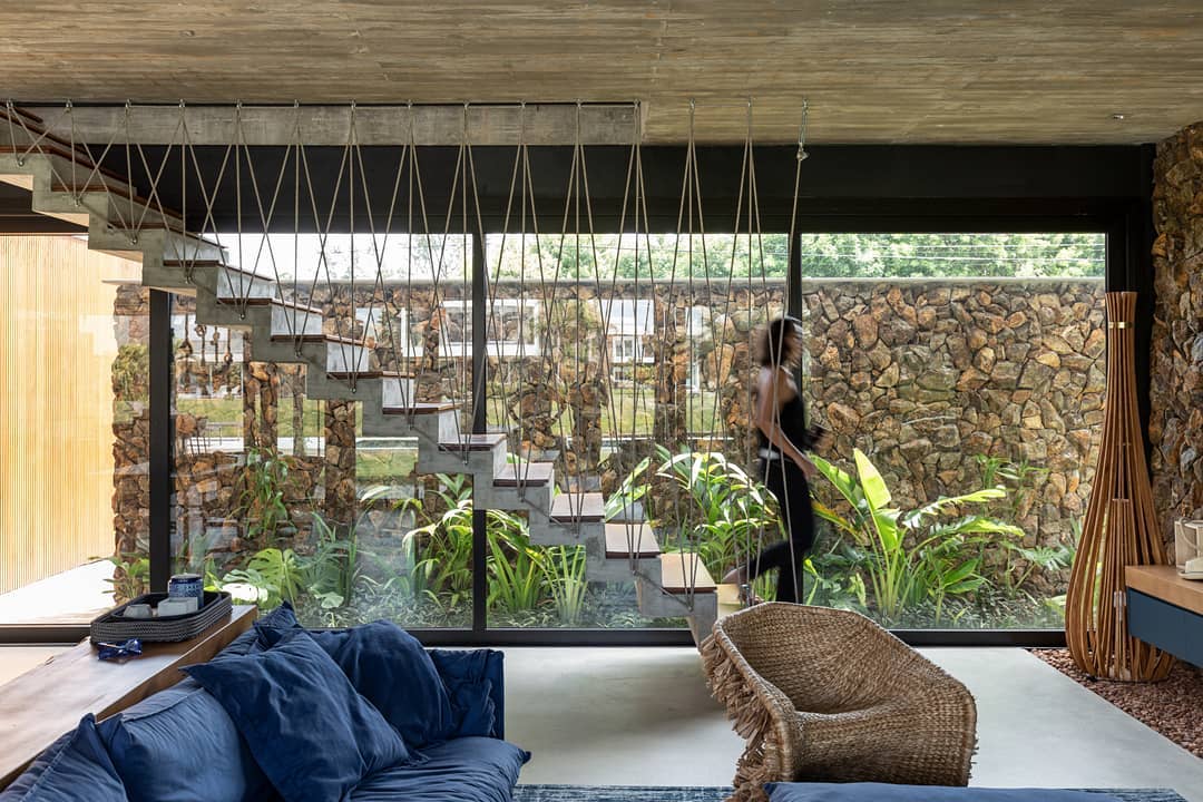 Salah satu desain unik yang menggunakan tali sebagai pengganti material konvensional seperti logam atau kayu. Tali-tali disusun secara vertikal dan terhubung antara langit-langit dan struktur anak tangga. Desain ini menciptakan tampilan yang ringan dan terbuka, karena tidak menghalangi aliran cahaya maupun pandangan. Meskipun terlihat sederhana, tali pada railing tangga ini tetap memberikan tingkat keamanan yang cukup baik.