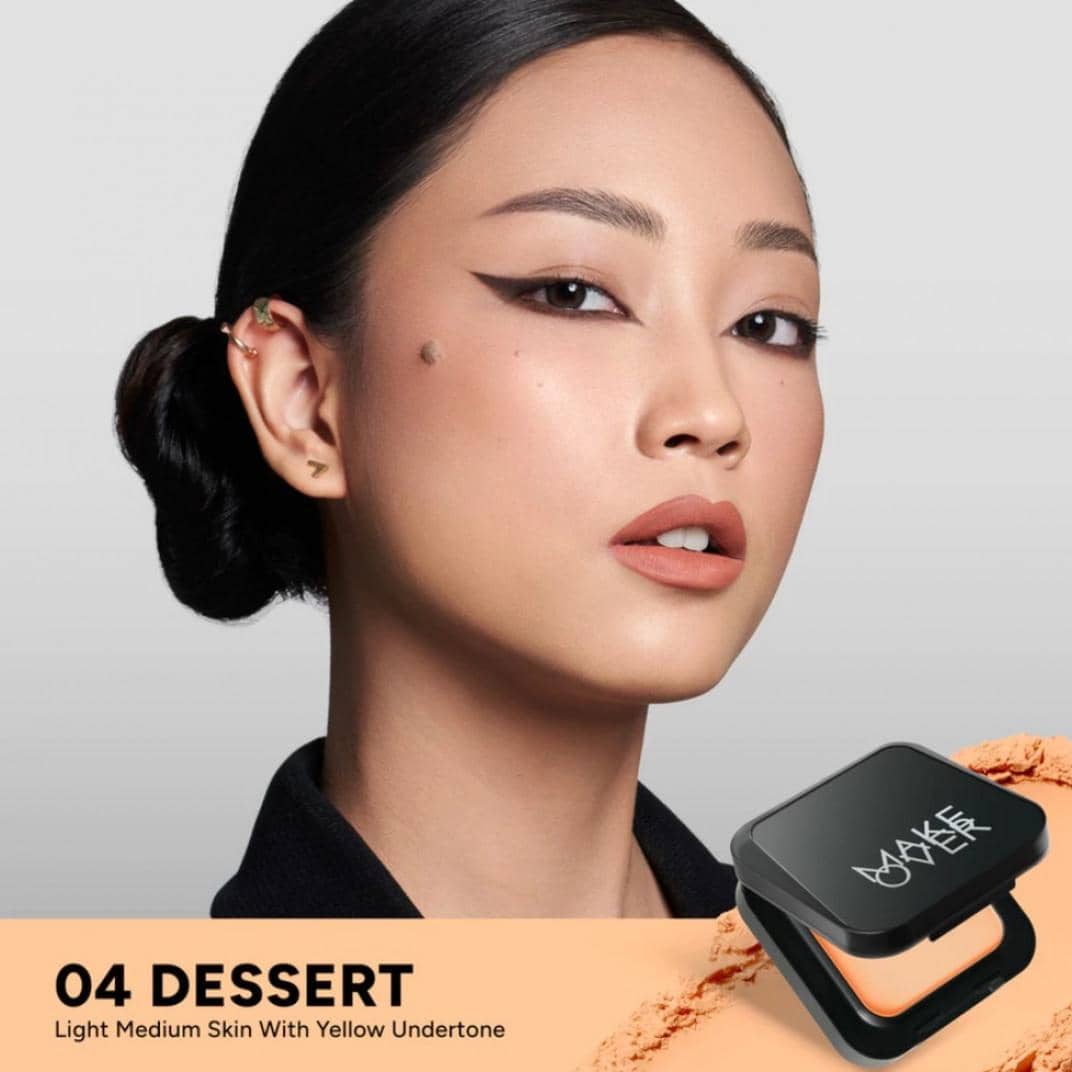 Selanjutnya, ada Make Over Perfect Powder Foundation shade Dessert (04) yang cocok untuk light medium skin dengan undertone kuning. Warna ini terlihat hangat dan menyatu di kulit langsat. Bedak ini membantu wajah tampak lebih cerah tanpa efek abu-abu. Coverage-nya pun cukup untuk meratakan warna kulit secara natural. Jadi, kamu bisa tampil segar dan juga maksimal karena memang didesain untuk pemilik undertone kuning.