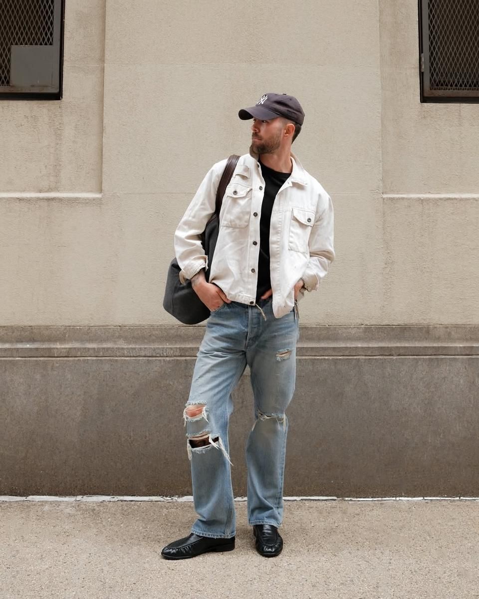 2. Untuk tampilan rebel, kamu bisa coba ripped denim jeans, kaos hitam polos, serta outer putih. Biar makin trendi, tambahkan baseball hat warna gelap
