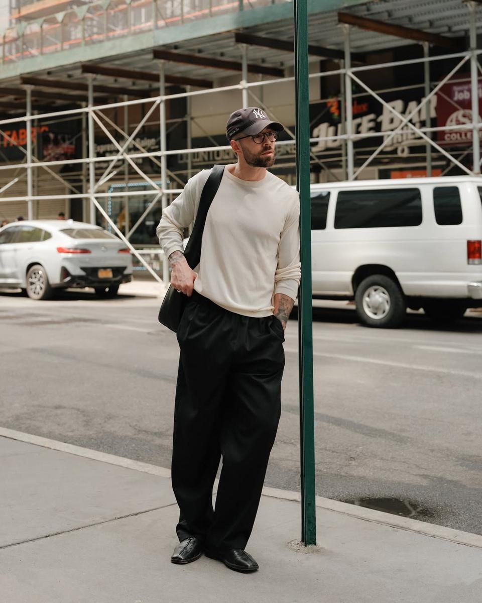 4. Bagi penyuka warna basic, paduan kaos longsleeve beige, loose pants hitam polos, dan topi baseball memang tak pernah mengecewakan