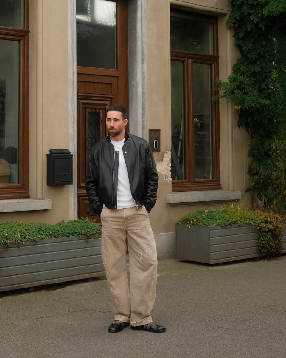 5. Bomber hitam bisa kamu maksimalkan dengan inner warna putih dan loose pants khaki. Pesonamu makin bertambah dengan formal shoes hitam, bro!