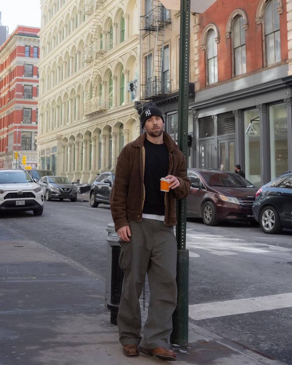 6. Kenakan inner hitam, outer berupa jaket dark brown, serta celana baggy warna charcoal untuk memberi kesan pria nonchalant namun tetap trendi