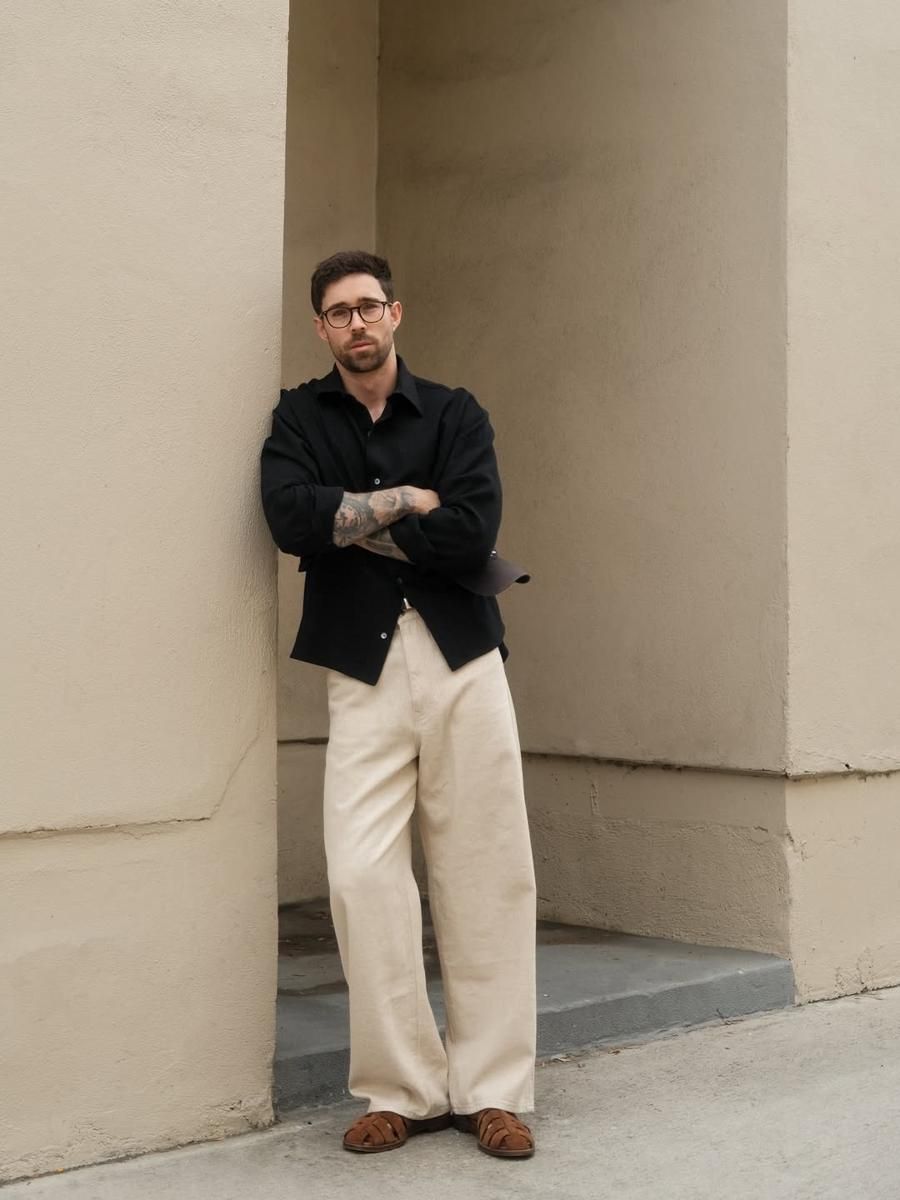 3. Kemeja hitam memang tak pernah salah. Kombinasikan dengan loose pants warna beige, fisherman sandal warna coklat, serta kacamata sebagai tambahan