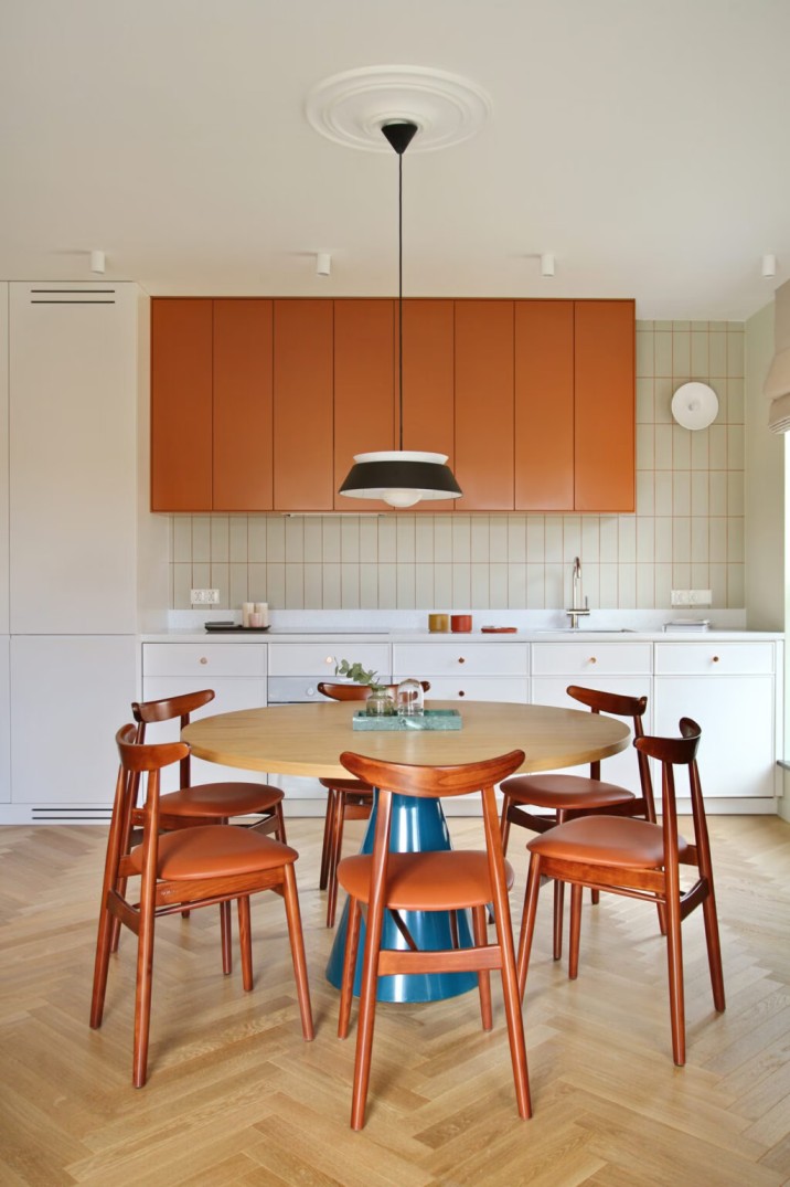 Keramik dinding berbentuk persegi panjang ini disusun secara vertikal, menciptakan visual yang rapi, modern, dan elegan. Dipadukan dengan kabinet dapur berwarna terakota dan meja makan berbahan kayu, membuat keseluruhan area dapur terasa lebih hangat dan nyaman.