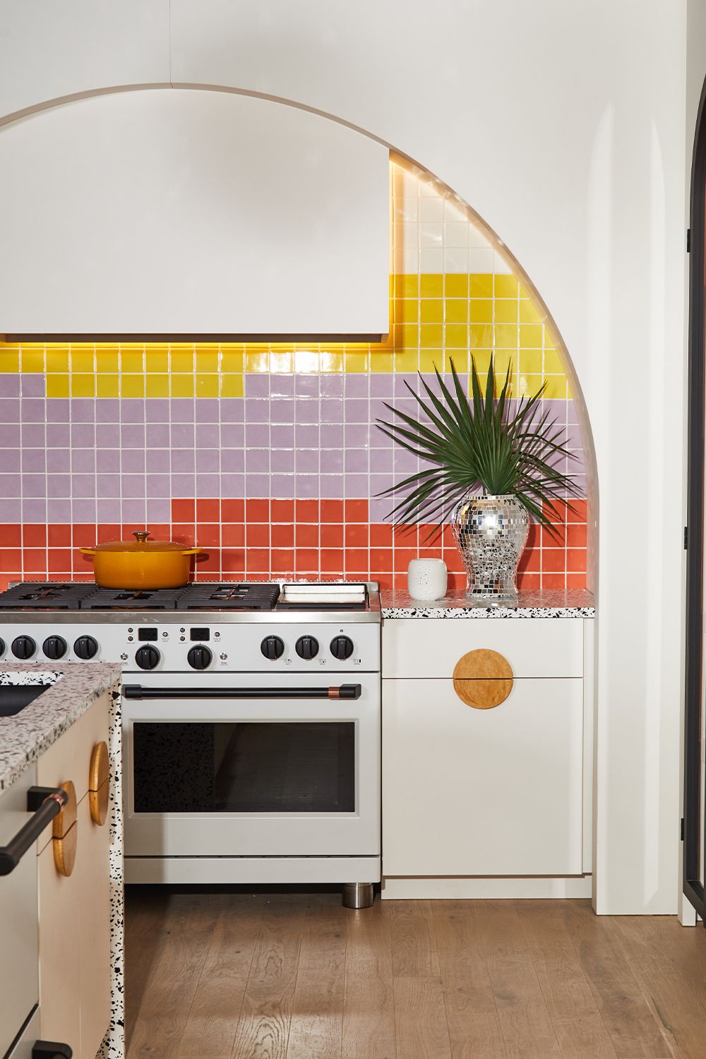 Kombinasi keramik persegi tiga warna ini menghadirkan tampilan modern-elegan dan tetap playful pada dapur yang didominasi warna putih. Pemilihan warna kuning, ungu pastel, dan merah lembut menciptakan visual dapur yang menarik, lebih hidup, dan berkarakter, tanpa terasa berlebihan. Sementara itu, finishing glossy pada keramik dinding mampu memantulkan cahaya dengan baik, sehingga membuat area dapur terasa lebih terang dan lapang. Secara keseluruhan dapur ini memiliki tampilan yang modern, elegan, playful, dan penuh gaya.