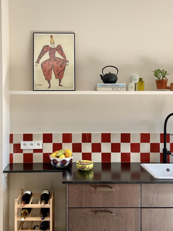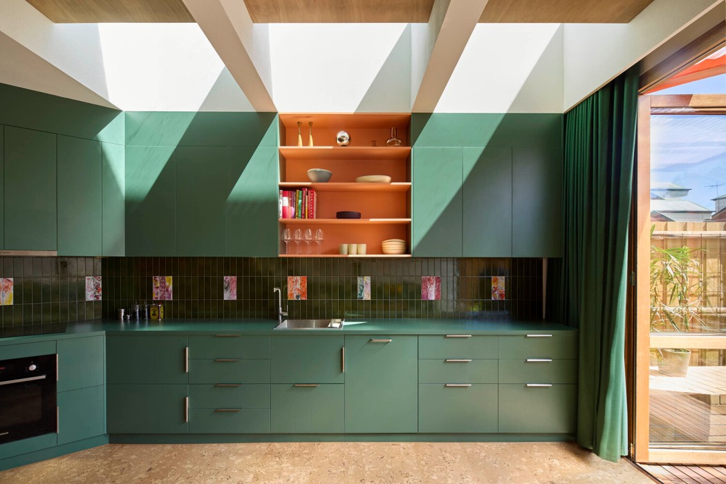 Dapur ini memadukan keramik persegi panjang berwarna hijau lembut dengan tile grout atau semen nat berwarna merah yang diaplikasikan pada keseluruhan dinding. Garis-garis nat berwarna merah mempertegas bentuk keramik dinding, sekaligus menjadi kontras warna menarik, tetap harmonis, dan tidak terasa berlebihan.