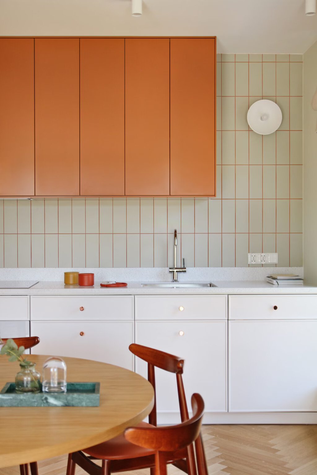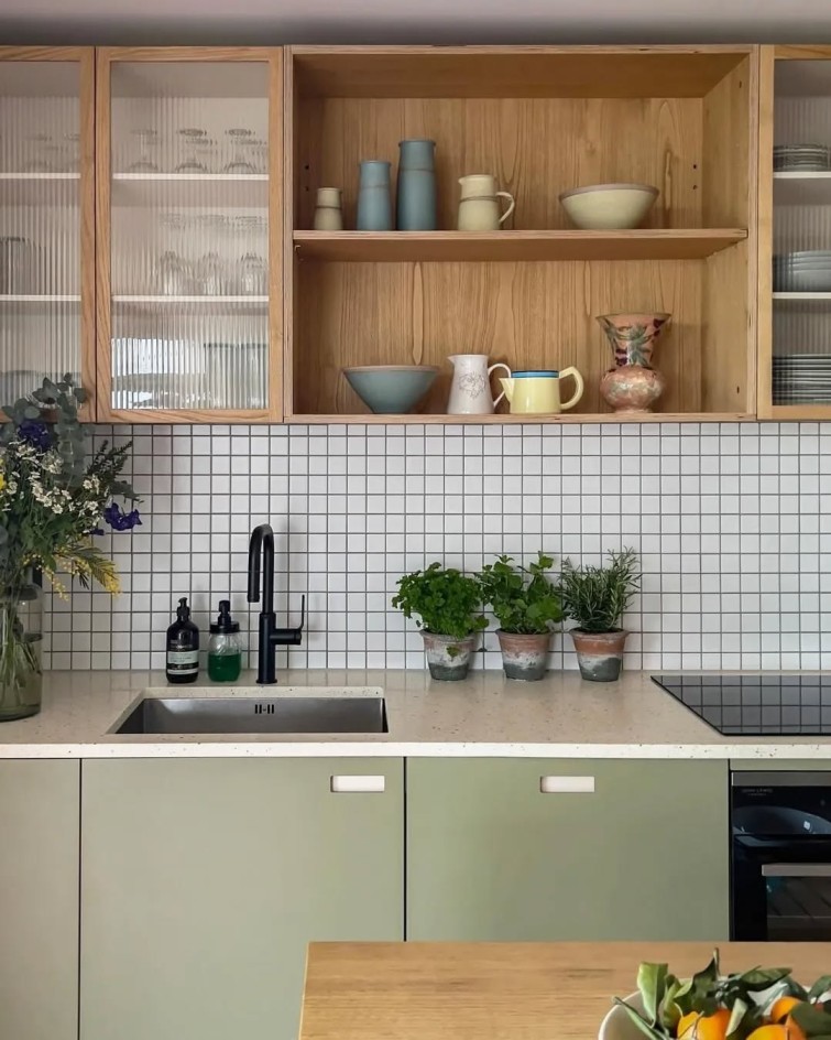 Dapur hasil rancangan PLUCK Kitchens ini menggunakan keramik persegi berwarna putih berukuran kecil yang disusun secara rapi, membentuk pola grid yang memiliki tampilan sederhana namun tetap terlihat menarik secara visual. Sambungan antar keramik menggunakan tile grout atau semen nat berwarna hitam, yang tidak hanya mempertegas pola grid, tetapi juga menambah kontras visual elegan yang membuat tampilan dinding dapur Anda terlihat lebih hidup. Dipadukan dengan kabinet atas berbahan kayu dan kabinet bawah berwarna hijau lembut, keseluruhan dapur ini terasa lebih hangat, menarik, dan tetap nyaman untuk digunakan sehari-hari.
