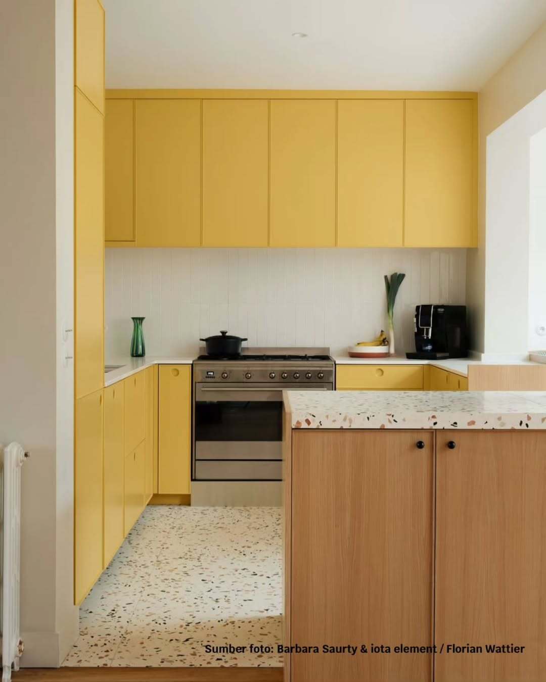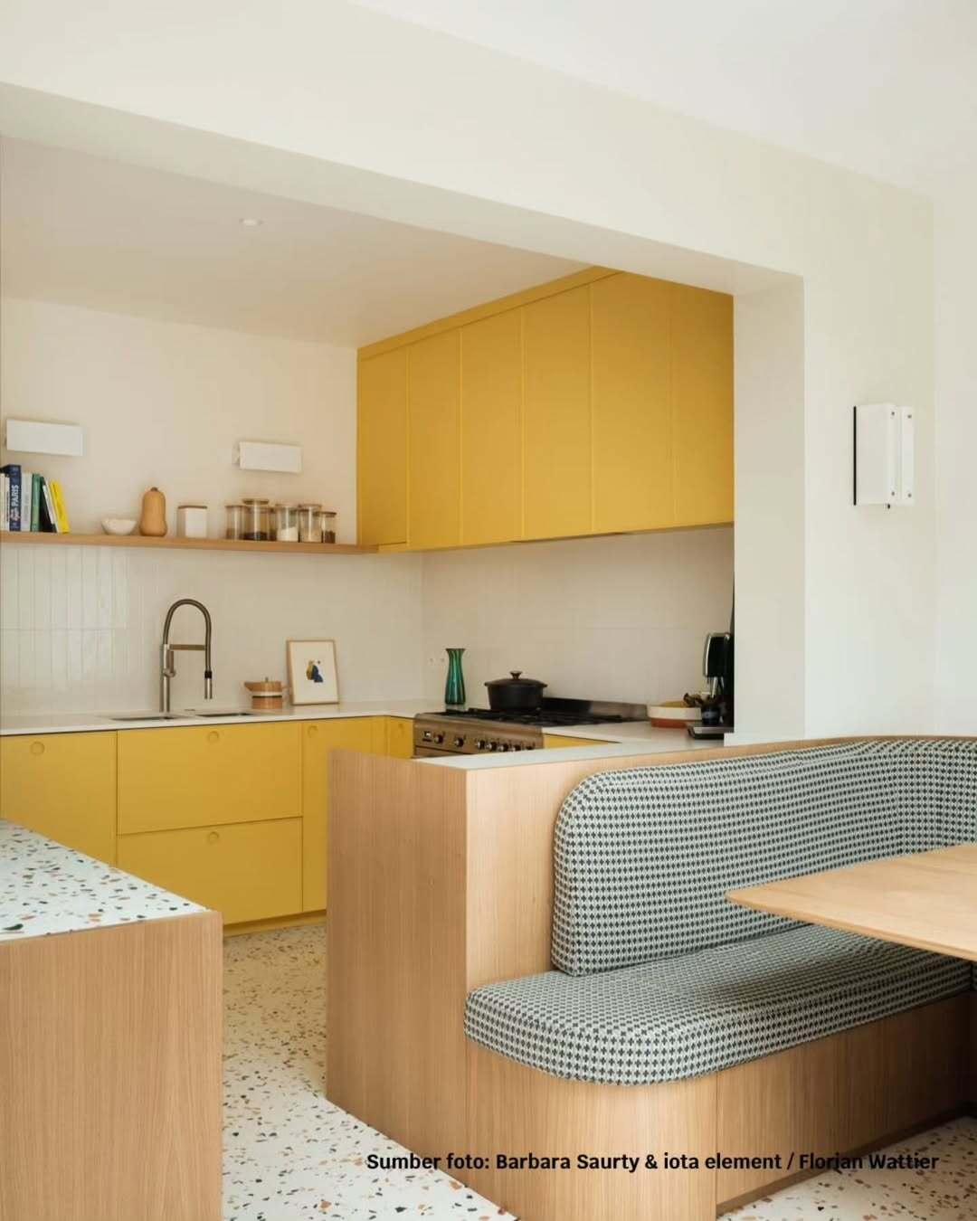 Warna putih juga mampu menciptakan kesan lebih terang dan luas, sehingga dapur terasa lebih lapang dan nyaman saat digunakan untuk aktivitas memasak sehari-hari. Meskipun berwarna terang, namun keramik dinding seperti ini tetap mudah dibersihkan dari noda maupun cipratan air, sehingga tampilannya tetap terjaga. Dipadukan dengan kitchen set berwarna kuning, furnitur kayu, dan lantai terrazzo, secara keseluruhan dapur hunian hasil rancangan Barbara Saurty & iota element ini semakin terlihat menarik, terasa hangat, segar, dan elegan.