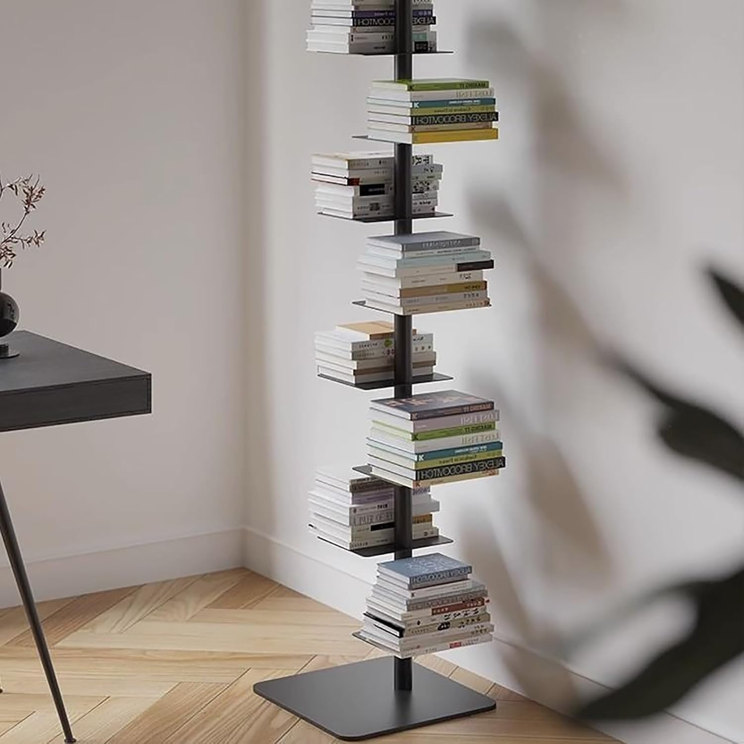 Rak buku model spine dirancang ramping dengan susunan zig-zag yang bertumpu pada rangka besi di tengah. Desain ini minimalis dan modern, cocok untuk sudut baca, ruang kerja, atau kamar tidur.