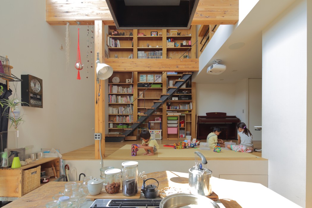 Rak buku ini terhubung dengan lantai mezzanine yang digunakan sebagai ruang multifungsi. Kombinasi material kayu natural dengan dinding putih menciptakan suasana yang hangat dan nyaman.