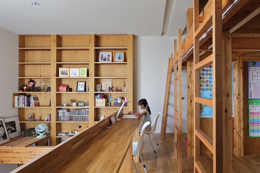 Rak buku dengan pola grid rapi berfungsi sebagai pembatas ruang dan area penyimpanan. Di antara grid tersebut, terdapat papan kayu panjang yang dapat digunakan sebagai meja kerja atau area membaca.