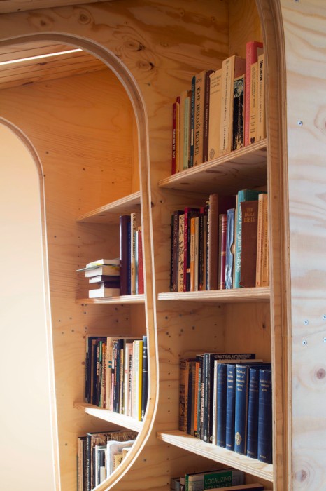Desain rak buku yang menyatu dengan struktur rumah menciptakan kesan utuh dan alami. Material kayu plywood digunakan untuk membuat keseluruhan elemen ruangan terlihat selaras, mulai dari dinding hingga ceiling. Desain ini menghadirkan suasana hangat dan natural yang kuat.