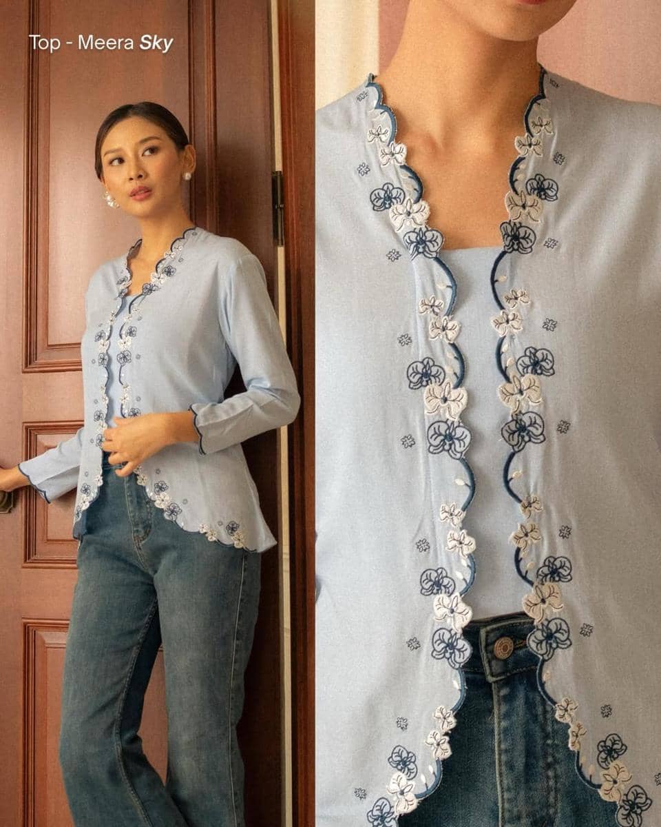 Kebaya modern berwarna light blue dengan detail payet memberikan kesan mewah. Dipadukan dengan rok batik motif sido asih menciptakan perpaduan tradisional dan modern yang seimbang. Tambahkan gelang dan kalung simpel untuk tampilan lebih elegan. Untuk alas kaki, pilih heels berwarna silver dengan aksen light blue di bagian depan sepatunya.
