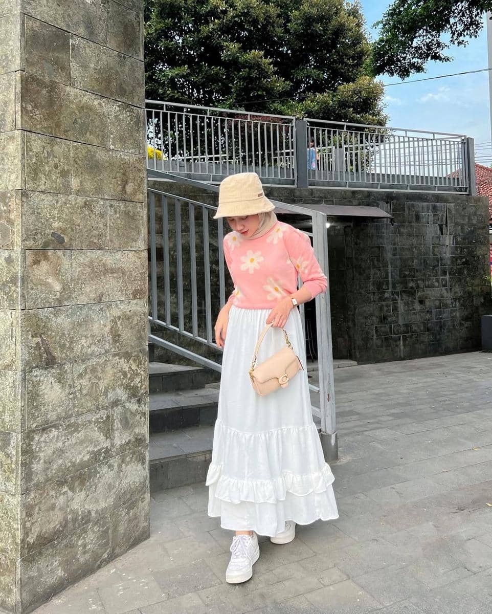 Suka dengan tampilan yang feminin dan fresh? Kamu bisa pilih tunik putih bermotif floral seperti di atas. Motif bunga tersebut mampu memberikan kesan ceria, cocok untuk liburan. Untuk bawahan, gunakan straight jeans agar tetap modis. Lengkapi gaya outfit-mu dengan pashmina warna cream. Tambahkan slingback heels putih untuk sentuhan elegan atau aksesori jam tangan berwarna rose gold agar terlihat lebih classy.Sweater dan Rok A-Line Ruffle
