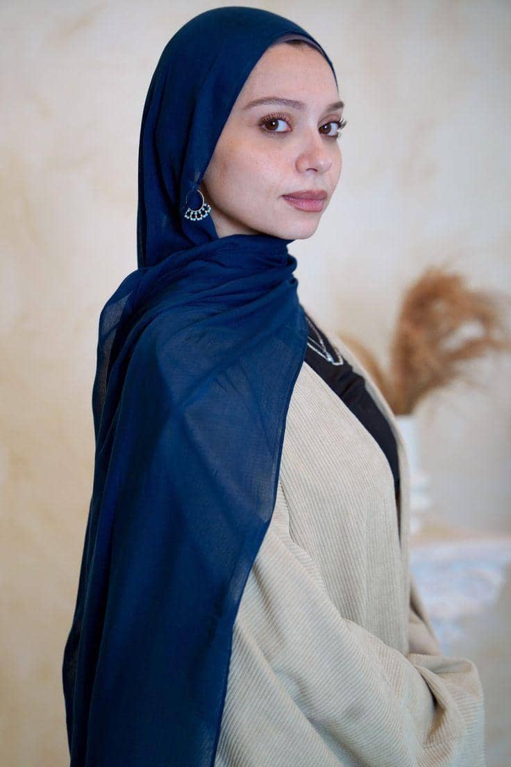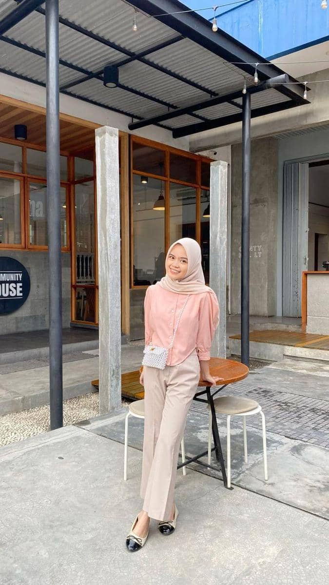 Warna cream memiliki kesan lembut dan manis saat dikenakan. Warna ini cocok digunakan bersama baju berwarna terang maupun pastel. Selain itu, hijab cream juga mudah dipadukan dengan warna lain yang terkesan lembut seperti pink, putih, atau peach. Untuk tampil seragam, kamu bisa memilih bawahan atau atasan dengan warna senada.Navy