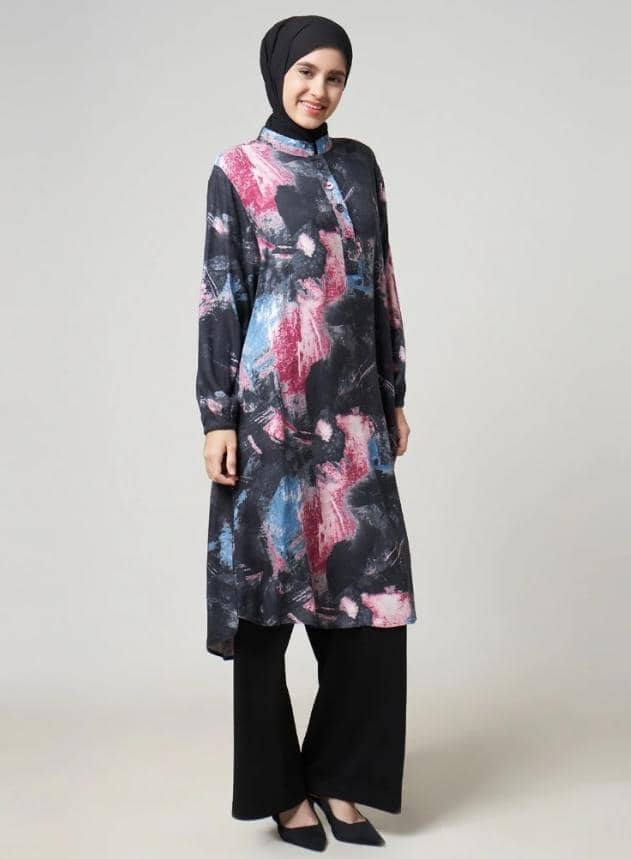 Rekomendasi baju tunik wanita muslimah yang motifnya unik dan abstrak bisa kamu temukan di Dhoby Ghout Tunik Wanita Misamores Series. Tunik ini memiliki motif warna-warni yang abstrak dan unik. Detail kerah shanghai dan half button memberikan kesan rapi. Harganya sekitar Rp189 ribuan.