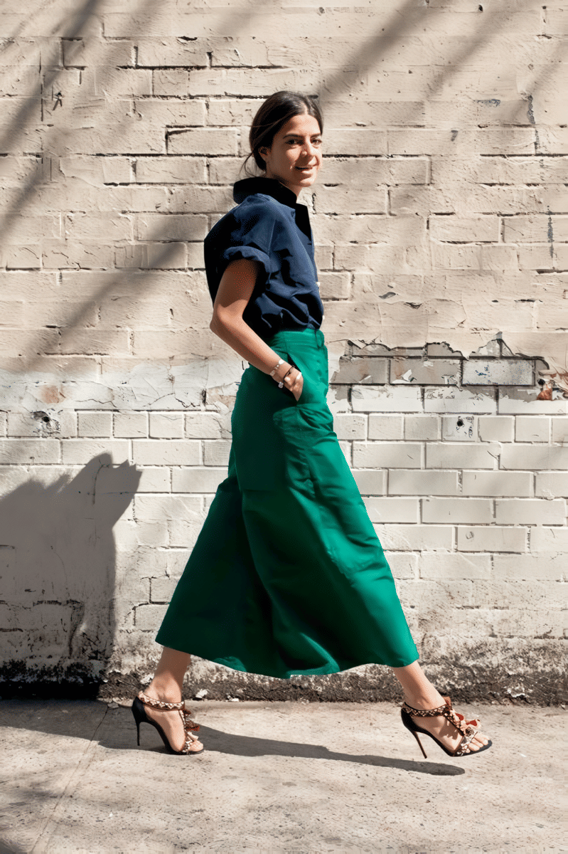 Perpaduan terakhir yang menarik adalah baju biru tua dengan celana hijau. Meski jarang digunakan, kombinasi ini bisa memberikan hasil yang unik dan menarik. Untuk menambah kesan spesial, kamu bisa memilih celana kulot A line. Tambahkan high heels dengan nuansa hobo untuk sentuhan ekstra.