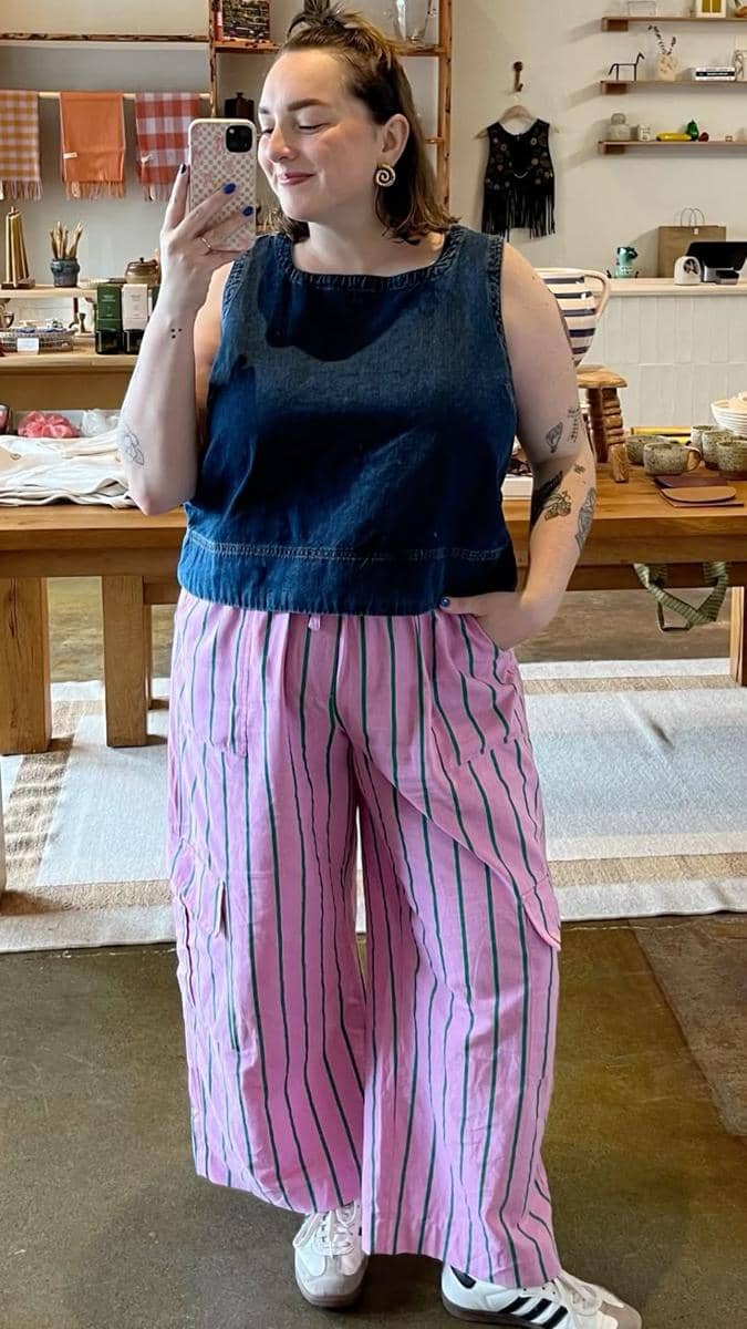 Kombinasi baju biru tua dengan celana pink bisa menjadi pilihan yang unik dan feminin. Celana pink striped yang sedang populer memberikan nuansa playful untuk penampilanmu. Kombinasi ini cocok jika kamu ingin mencoba menggunakan warna cerah dalam outfit harian.