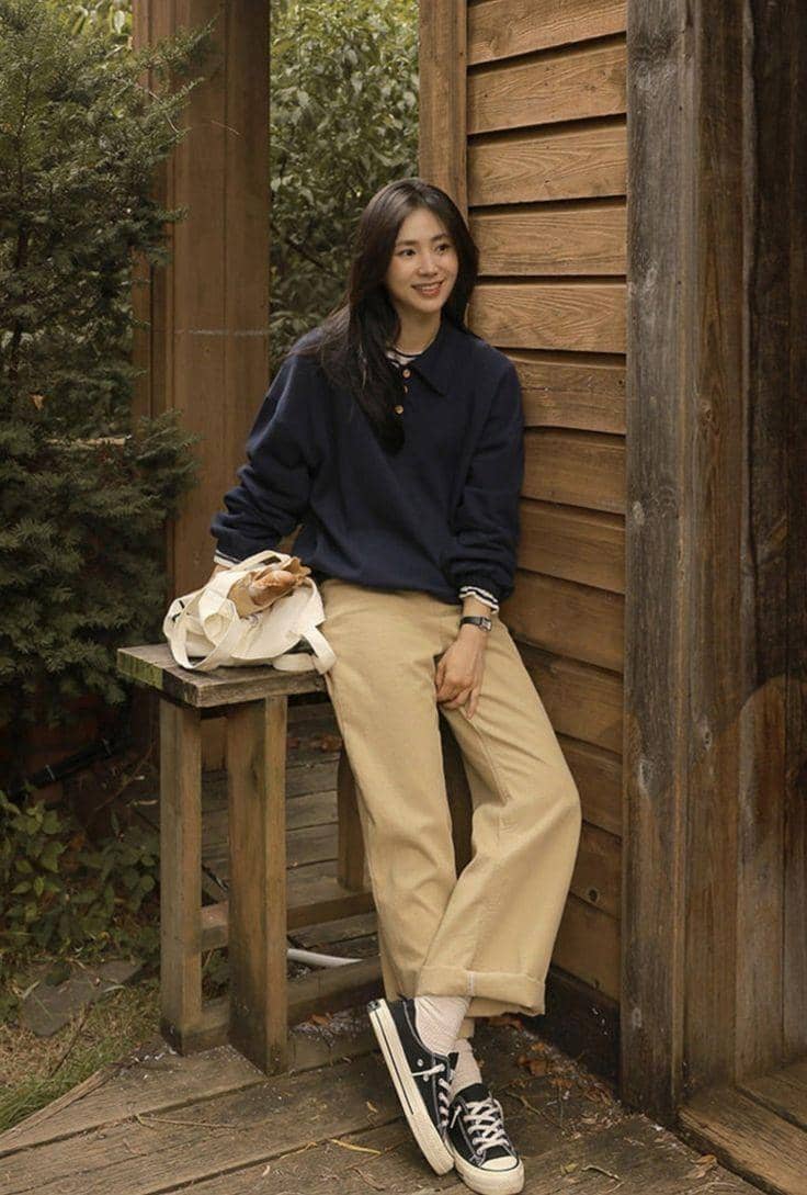 Salah satu kombinasi yang sempurna adalah baju biru tua dengan celana krem. Warna lembut ini akan menyeimbangkan kesan tegas dari baju biru tua yang kamu kenakan. Perpaduan antara biru tua yang gelap dan krem yang cerah menciptakan kontras yang indah. Kamu bisa menggunakannya untuk gaya kasual atau santai.
