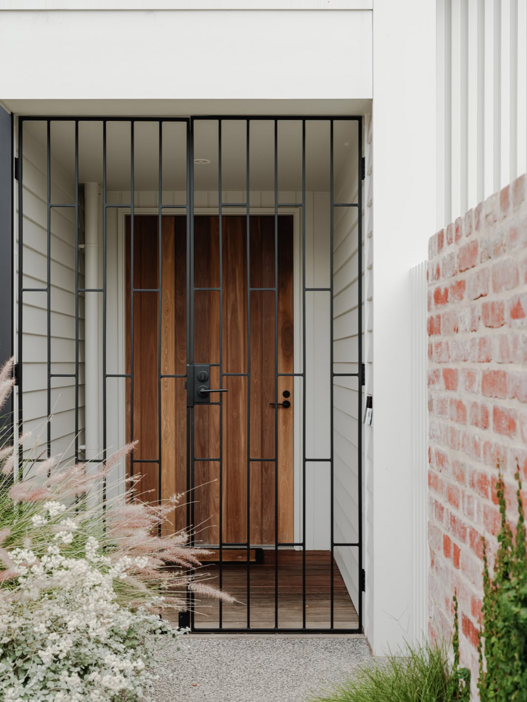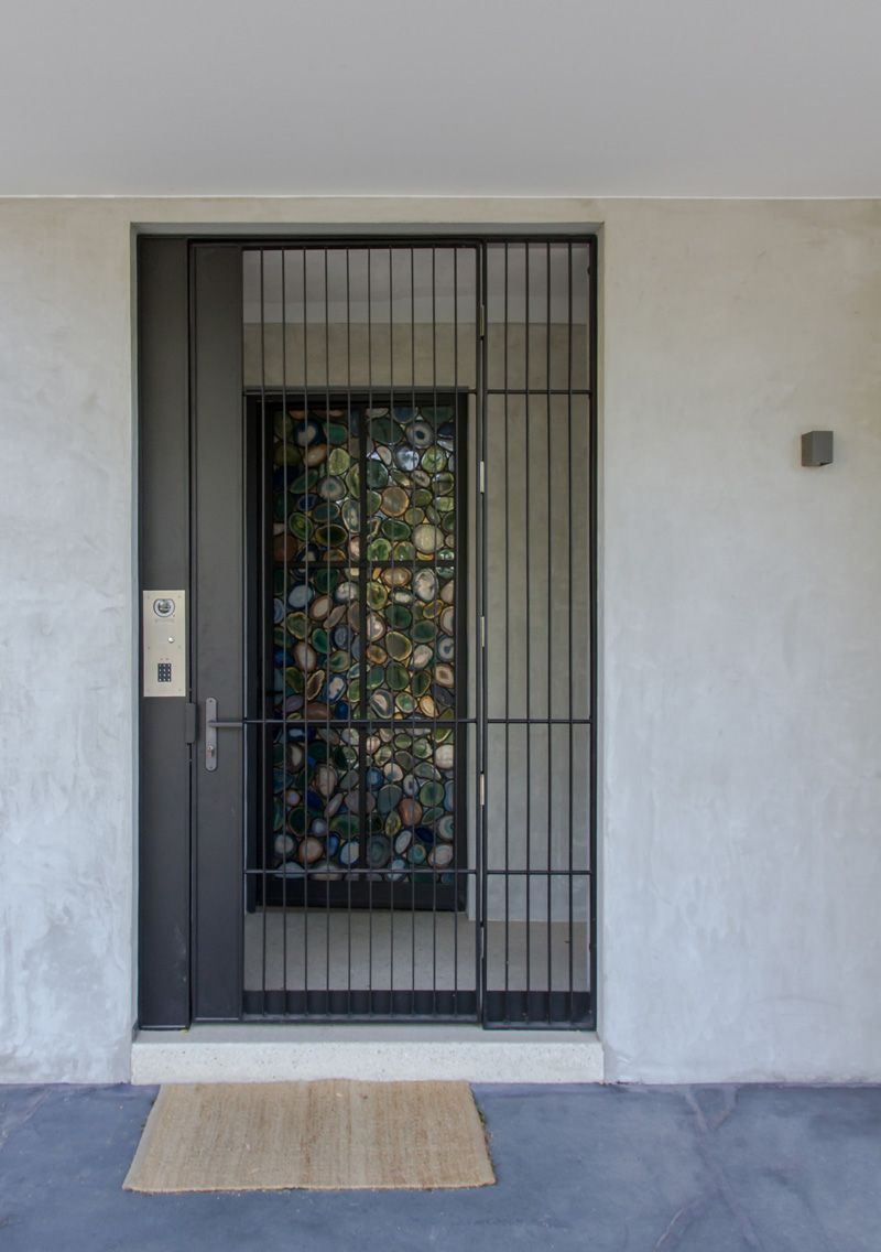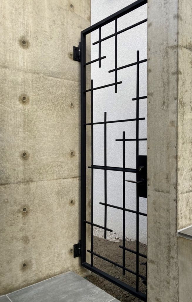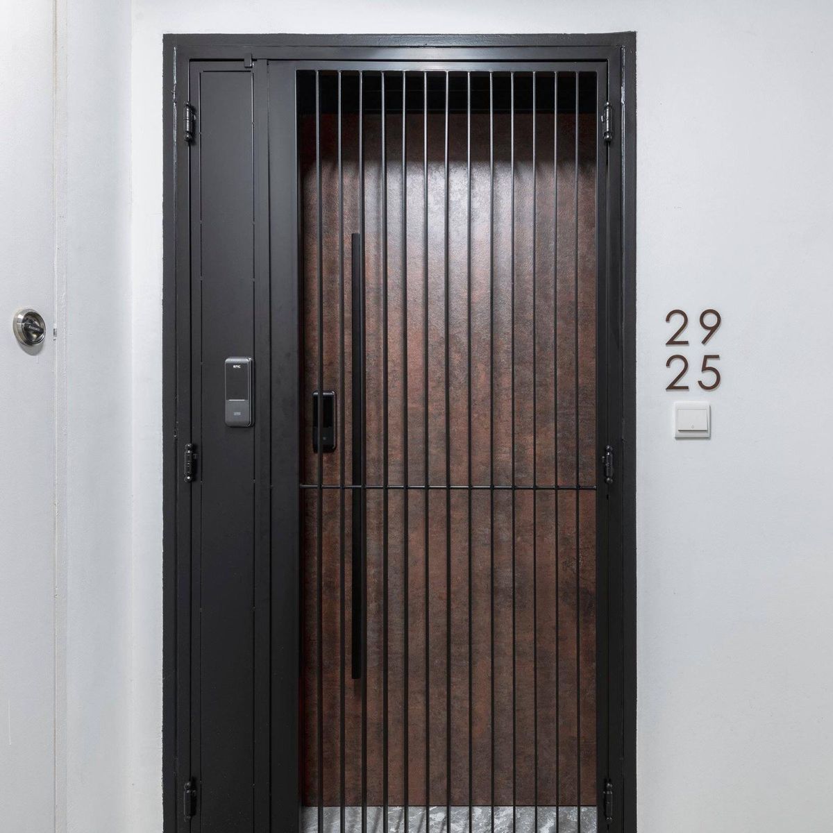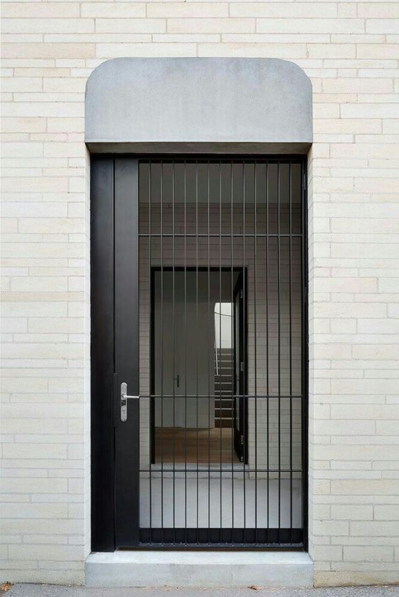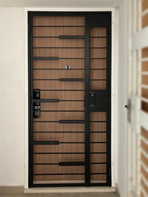 Finishing hitam matte memberikan kesan elegan dan modern pada tampilan pintu.Teralis Pintu dengan Desain Grid Modern