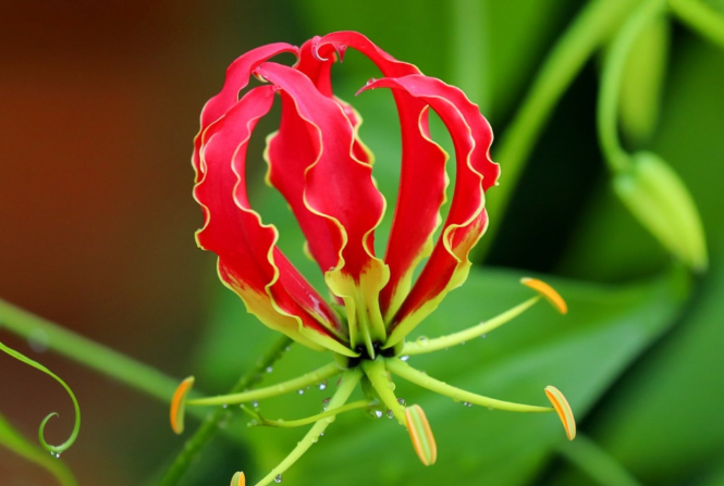 Sering disebut sebagai flame lily atau fire lily, bunga yang menarik perhatian ini menonjol dengan kelopak merah tua dan kuningnya yang melengkung dramatis seperti nyala api yang berkedip-kedip. Selain penampilannya yang mencolok, kelopak bunga yang melengkung secara alami dan pola pertumbuhan yang merambat menjadikannya favorit untuk rangkaian bunga yang mencolok.